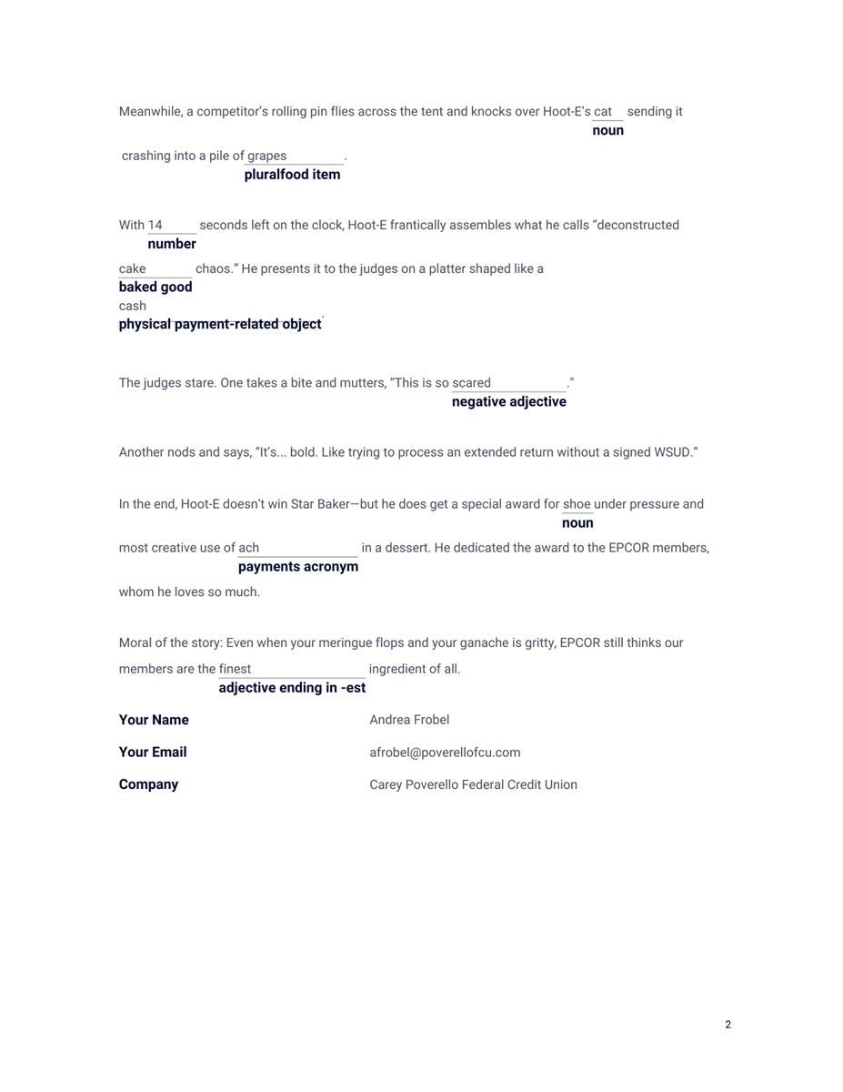 You had some creative creations for Chef Hoot-Eโs MadLib! With hilarious and unexpected answers, laughter was served during all of Week 2!