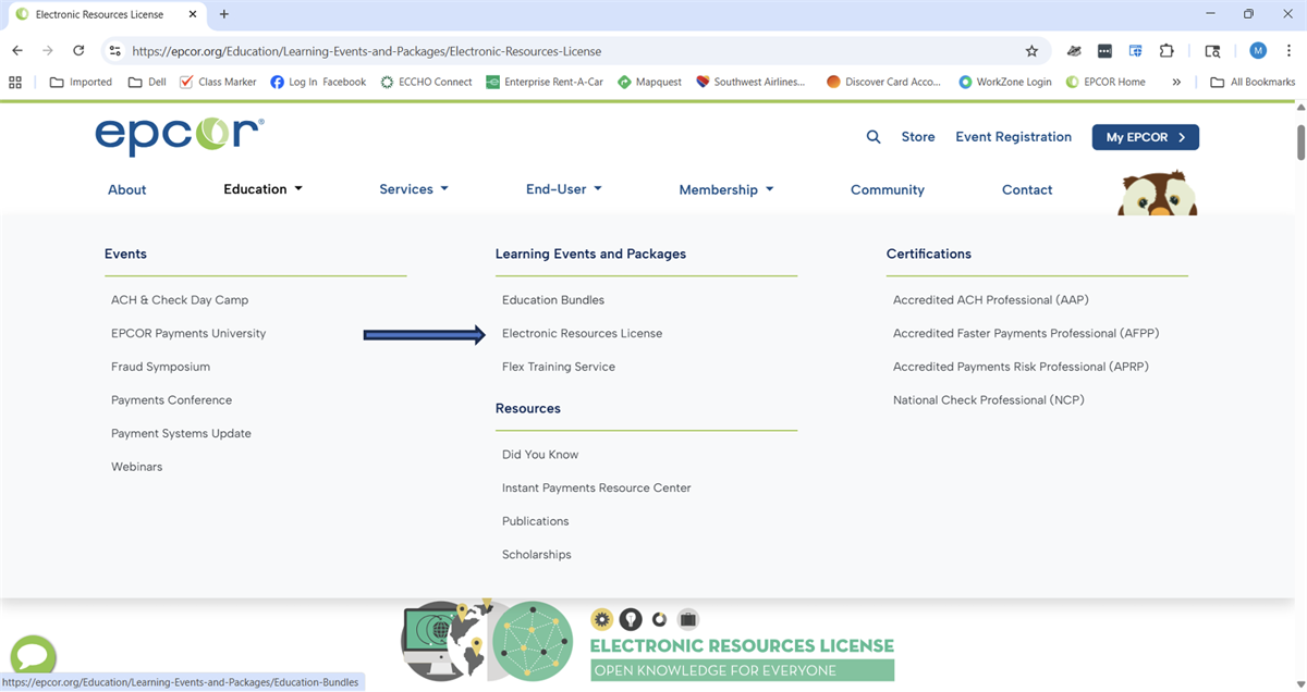 2. From the top menu, click the “Education” tab, select the drop-down and click on Electronic Resource License under the Learning Events and Packages section.